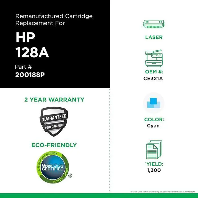 Our premium replacement imaging supplies are designed to be a true quality alternative to the OEM while offering significant savings. Our broad product line offers a superior product selection, exceptional performance, and significant cost savings. Our imaging supplies are 100% guaranteed to perform like the original HP Color LaserJet Pro CM1415, CP1525NW (HP 128A). It yields 1,300.