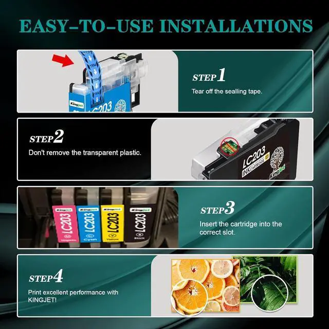 Kingjet AdvantageKingjet focus on ink cartridge R&D and manufacturing over 15 years, our LC203XL LC201XL ink cartridge has lastest smart chip, fit all new firmware version perfectly, easy to install; Print sharp black text and bright-coloured output, excellent performance; Multi-layer Packaging, no leaking.
