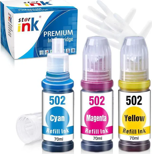 • Package Content: 70ml 502 Cyan ink bottles (T502220), 70ml T502 Magenta ink bottles (T502320), 70ml T502 Yellow ink bottles (T502420).3 pack total, ink type: Dye.