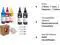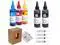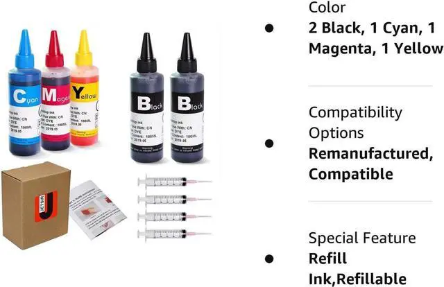 Included: Each bottle of ink is 100ml. 2 black, 1 cyan, 1 magenta, 1 yellow, instructions for refillable cartridges, 4 syringes.