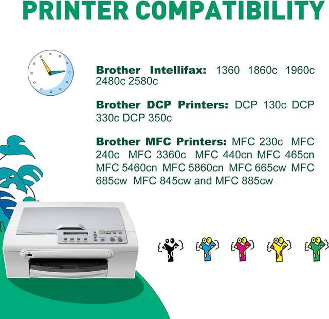 • For use in the following Brother DCP, Intellifax, and MFC printers: MFC-230C, MFC-240C, MFC-440CN, MFC-465CN, MFC-665CW, MFC-685CW, MFC-845CW, MFC-885CW, MFC-3360C, MFC-5460CN, MFC-5860CN DCP-130C, DCP-330C, DCP-350C, FAX-1360, FAX-1860C, FAX-1960C, FAX-2480C, FAX-2580C