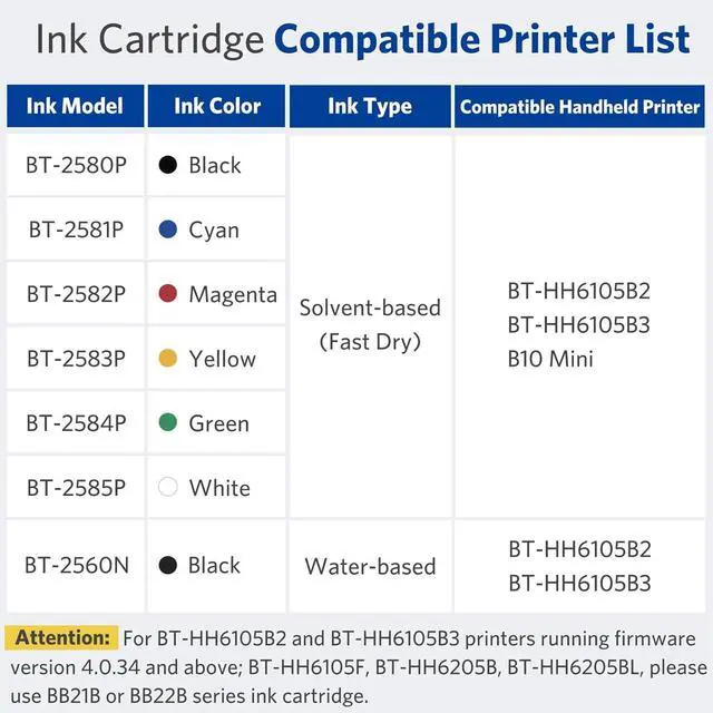 Ink Compatibility: Compatible only with BT-HH6105B2 and BT-HH6105B3 handheld printers running firmware V1069 or 1.0.10 to 3.0.28. For firmware 4.0.34 or models BT-HH6105F, BT-HH6205B and 6206BL, please use BB21B or BB22B series ink instead