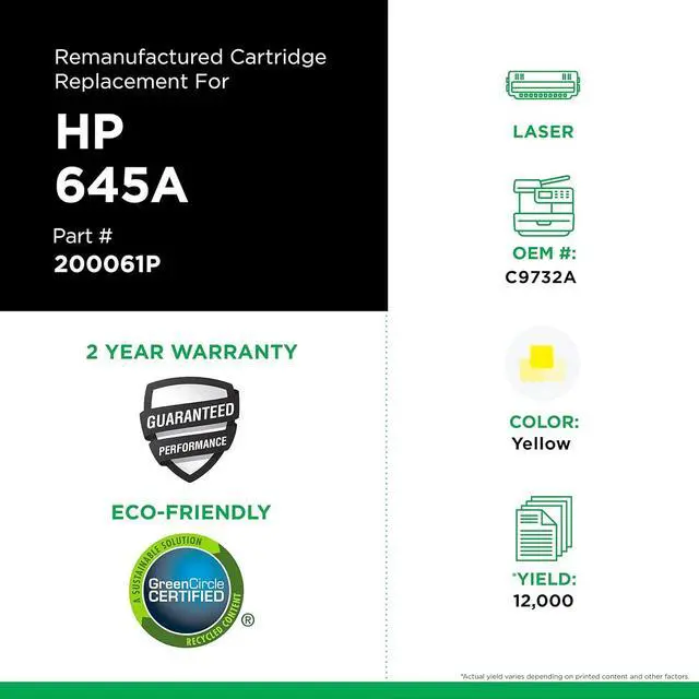 Our premium replacement imaging supplies are designed to be a true quality alternative to the OEM while offering significant savings. Our broad product line offers a superior product selection, exceptional performance, and significant cost savings. Our imaging supplies are 100% guaranteed to perform like the original HP Color LaserJet 5500, 5500DN, 5500DTN, 5500HDN, 5500N, 5550N, 5550DTN (HP 645A). It yields 12,000.