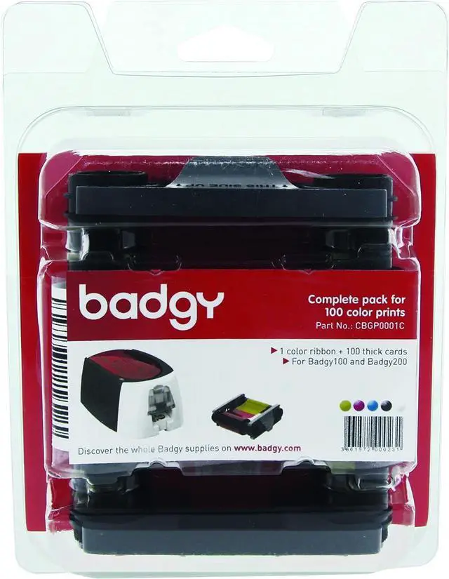 Compatible ONLY with Evolis Badgy100 & Badgy200 printers Everything you need for up to 100 single-sided color prints 100 Card size CR80 (same dimensions as a credit card) 1 YMCKO color ribbon for 100 prints