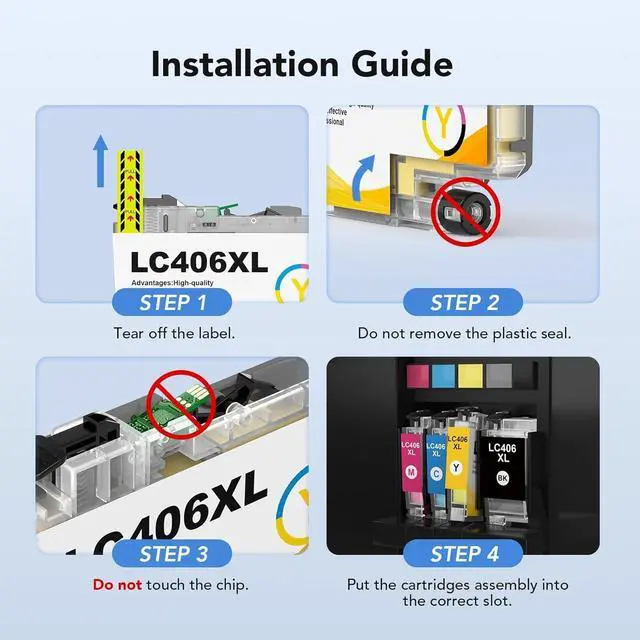 Package Content: 1 x Black LC406XL Ink, 1 x Cyan LC406XL Ink, 1 x Magenta LC406XL Ink , 1 x Yellow LC406XL Ink, 1 x User Guide