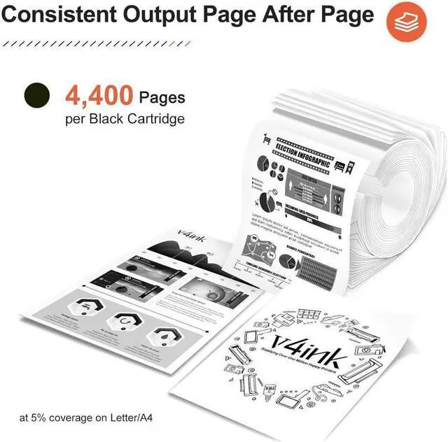 Experience an amazing range of colors when you use v4inkcartridges. Every cartridge is backed of high-performance manufacturingexperience from ISO 9000 / ISO 14001 certified state-of-the-artfacilities, thoroughly tested for performance and reliability.