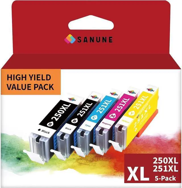 1x PGI-250XL PGBK, 1x CLI-251XL Black, 1x CLI251XL Cyan, 1x CLI 251 XL Magenta, 1x 251XL Yellow, as replacement for canon 250 and 251 ink cartridges