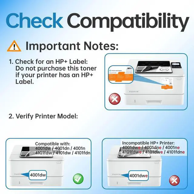 1. Please be noted that 148A Toner DO NOT work with HP 4001dwe 4001dne 4001ne 4101fdwe 4101dwe 4101fdne Printers.