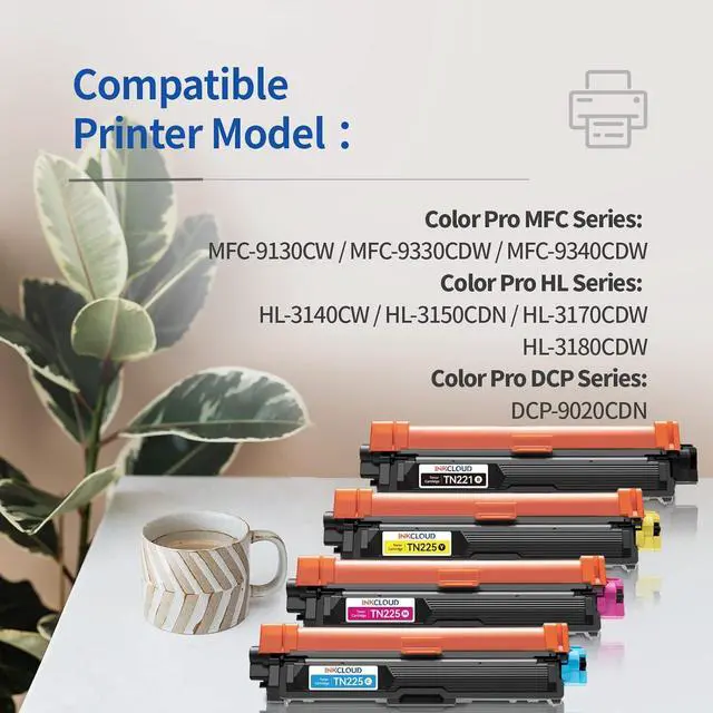 Our TN221 TN225 Compatible Toner Cartridges Brother TN221TN-225 are designed to work perfectly with your Brother printer: Brother HL-3140CW, HL-3150CW, HL-3170CDW, HL-3180CDW, MFC-9130CW, MFC-9330CDW, MFC-9340CDW, DCP-9020CDN Laser printers.