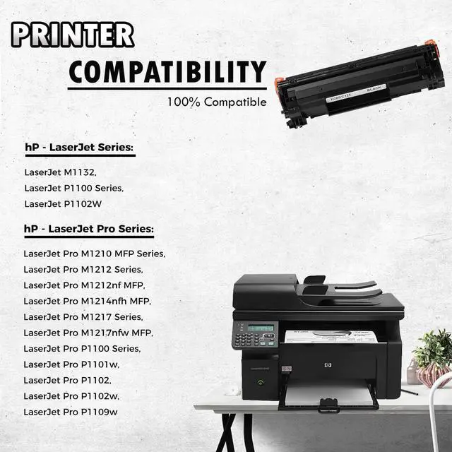 Compatible Printers: LaserJet M1132 LaserJet P1100 Series LaserJet P1102W LaserJet Pro M1210 MFP Series LaserJet Pro M1212nf MFP LaserJet Pro M1214nfh MFP LaserJet Pro M1217nfw MFP LaserJet Pro P1100 Series LaserJet Pro P1102 LaserJet Pro P1109w