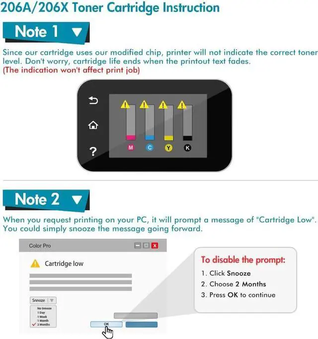 Superior quality: High-efficiency 206A with chips toner to get the clear text and vivid color printing. These 206A toner cartridges are alread installed with orginal chips, No need to transfer orginal 206A toner chip to them