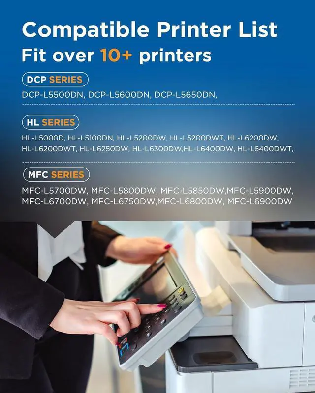 • Compatible with DCP-L5500DN, DCP-L5600DN, DCP-L5650DN, HL-L5000D, HL-L5100DN, HL-L5200DW, HL-L5200DWT, HL-L6200DW, HL-L6200DWT, HL-L6250DW, HL-L6300DW, HL-L6400DW, HL-L6400DWT, MFC-L5700DW, MFC-L5800DW, MFC-L5850DW, MFC-L5900DW, MFC-L6700DW, MFC-L6750DW, MFC-L6800DW, MFC-L6900DW