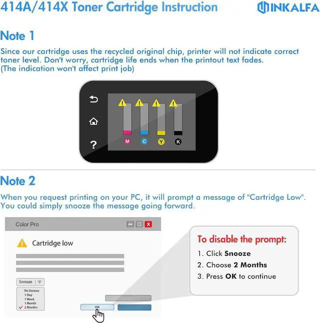 Superior quality: High-efficiency 414A with chips toner to get the clear text and vivid color printing. These 414A toner cartridges are alread installed with orginal chips, No need to transfer orginal 414A or 414X toner chip to them