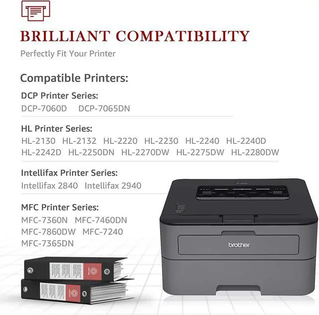Printer Models: Compatible for Brother DCP-7060D, DCP-7060R, DCP-7065DN, DCP-7070, DCP-7070DW, DCP-7057R, HL-2270DW, HL-2280DW, HL-2130, HL-2132, HL-2220, HL-2230, HL-2240, HL-2240D, HL-2240R, HL-2240DR, HL-2242D, HL-2250DN, HL-2250DNR, Intellifax 2840, 2940, MFC-7240, MFC-7360N, MFC-7460DN, MFC-7860DW, MFC-7470, MFC-7365DN Toner Cartridge Printer