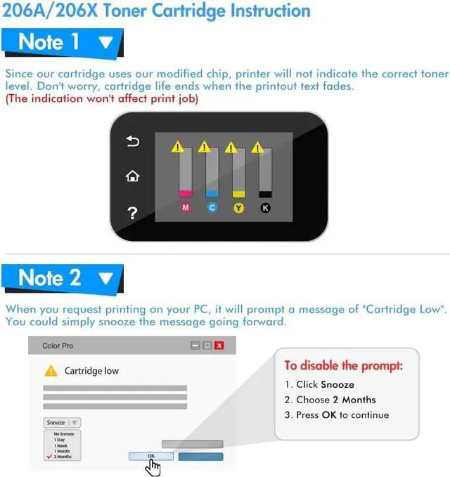 Superior quality: High-efficiency 206X with chips toner to get the clear text and vivid color printing. These 206X toner cartridges are alread installed with orginal chips, No need to transfer orginal 206X toner chip to them