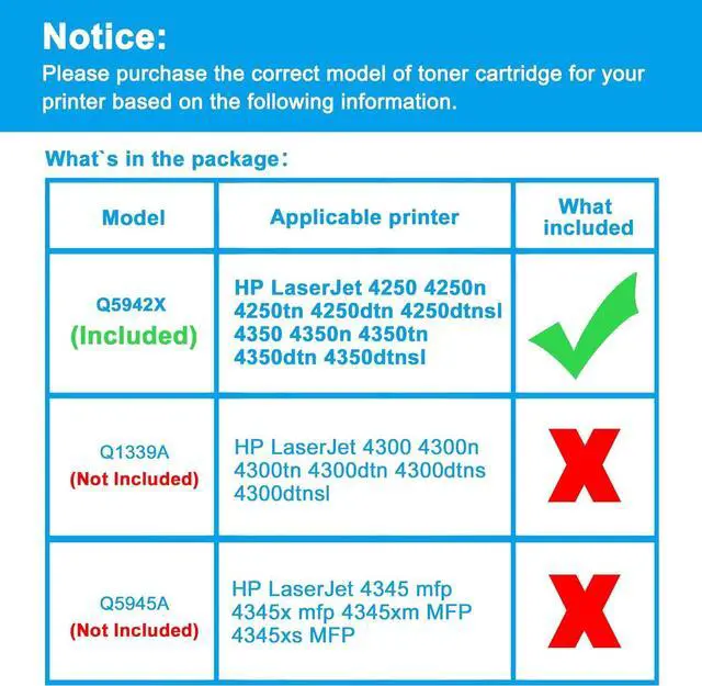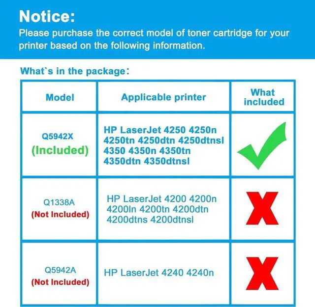 • Compatible PrintersReplacement for HP LaserJet 4250 4250n 4250tn 4250dtn 4250dtnsl 4350 4350n 4350tn 4350dtn 4350dtnsl (NOT FOR HP LaserJet 4240 4240n)