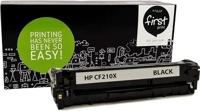 Compatible HP 131X CF210X Black Toner Cartridge - High Yield of HP 131A CF210A 2,400 Pages Yield @5% coverage Compatible with HP LaserJet Pro 200 Color M251n, M251nw, M276n, M276nw First print is your # 1 canadian toner cartridges supplier since 2005. Winner of many business awards over the years, First Print continue year after year to offer the best possible products for our customers. We offer bilingual (French and English) customer service and NO WORRIES of return of the product if you are not satisfied. Certified by ISO9001, ISO14001, CE and SMTC.