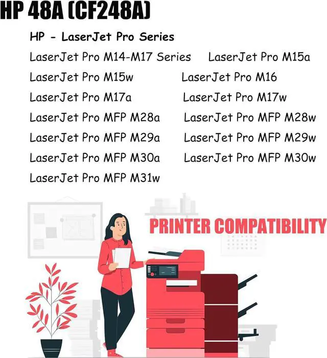 • Compatible with HP LaserJet Pro M15a, LaserJet Pro M15w, LaserJet Pro M16, LaserJet Pro MFP M28a, LaserJet Pro MFP M28w, LaserJet Pro MFP M29a, LaserJet Pro MFP M29w, LaserJet Pro MFP M31w.