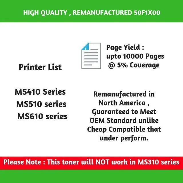 This not cheap compatible toner that will under perform, This is HIGH QUALITY toner which will provide you with highest quality results Compatible with : MS410/MS410d/MS410dn/MS415/MS415DN/MS510/MS510dn/MS610/ MS610DN/MS610DTN/MS610DE/MS610DTENot Compatible with MS310/MS310d/MS310dn/MS312/MS312DN MS315 MS315dn Page Yield : 10000 Pages Product OEM # 50F1X00,501X Eco Friendly & Guaranteed to meet or exceed all OEM standards for page yield and print quality. Free Returns & 1 Year warranty Delivered in 3-6 Business days in Most cities in Canada.