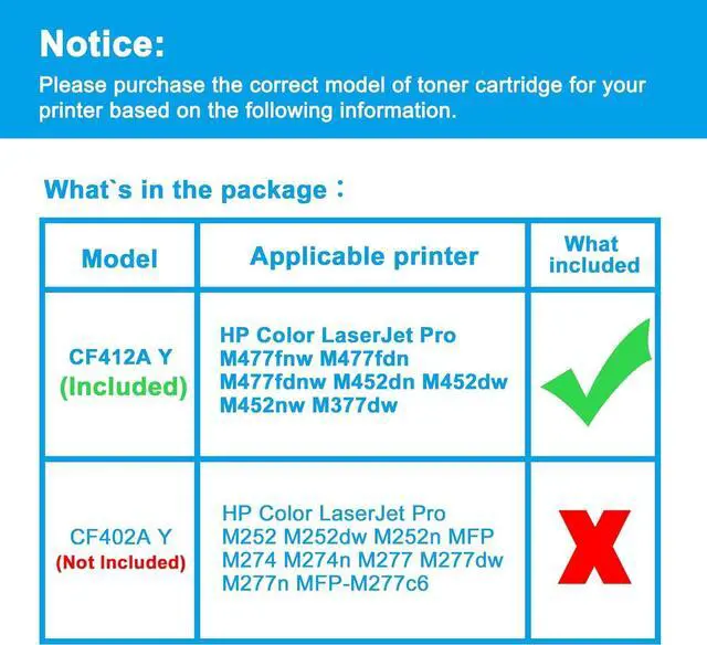 • Compatible PrintersReplacement for HP Color LaserJet Pro MFP M477fnw MFP M477fdn MFP M477fdnw MFP M452dn MFP M452dw MFP M452nw MFP M377dw