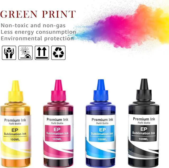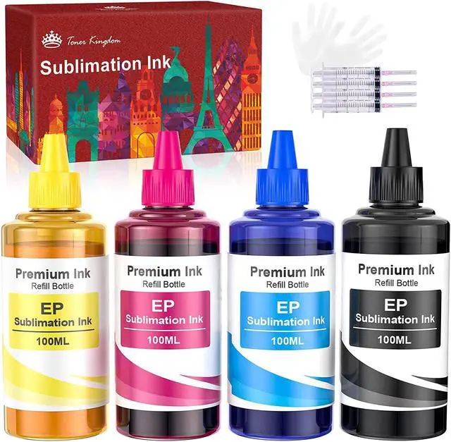 Package Content: 1 x 100ml black, 1 x 100ml cyan , 1 x 100ml magenta , 1 x 100ml yellow , total 400ml Sublimation ink for et 2720 wf 7710 printer; 4 x syringes, 4 x disposable gloves