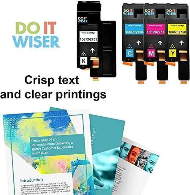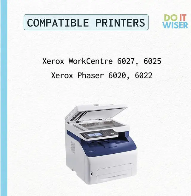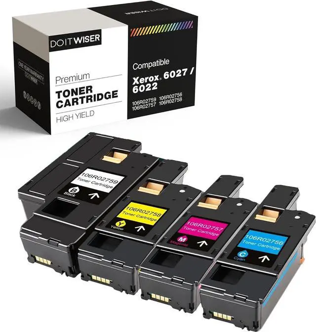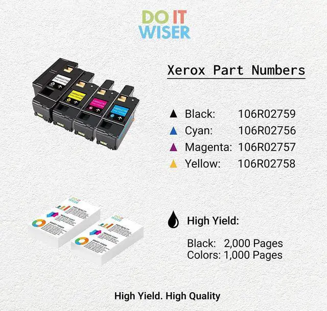 Do it wiser Remanufactured toner cartridges are compatible with Xerox WorkCentre 6027, 6025, and Xerox Phaser 6022, 6020 printers. Replaces part numbers Xerox 106R02759, Xerox 106R02758, Xerox 106R02757, Xerox 106R02756. Each black cartridge has a high page yield of 2,000 pages and each color cartridge (cyan, magenta, and yellow) has 1,000 pages at 5% coverage. Do it Wiser Toner Cartridges are guaranteed to work flawlessly, certified by ISO 9001 international quality standard, ISO 14001 environmental management, and free of lead and hazardous materials.