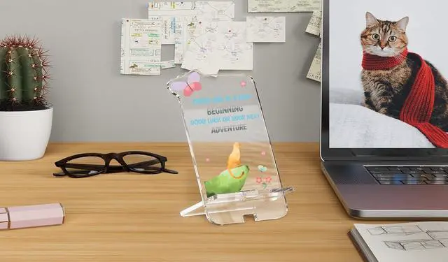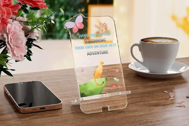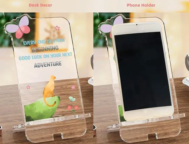 LOVELY and HEARTWARMING DESIGN---This clear acrylic phone holder is printed with a cool cat standing high and looking up just like a lion with meaningful text. It is a great gift for someone you care about. It serves as a keepsake. And Also can be a phone holder when necessary. It can be placed in any conspicuous place and will bring a good mood to someone every day.
