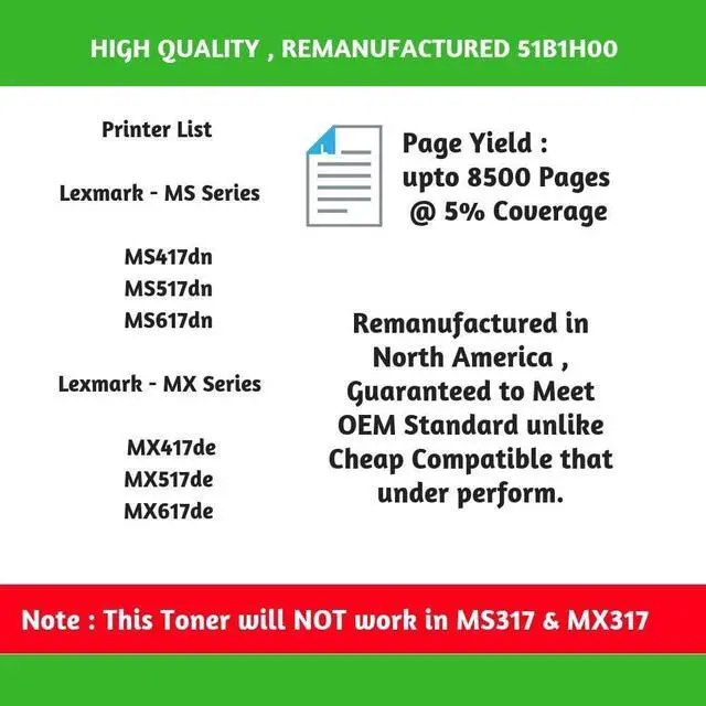 Best Re-Manufactured Toner 51B1H00 for use in MS417/MS517/MS617/MX417/MX517/MX617 High Capacity 8500 Page Yield - Ships from Canada