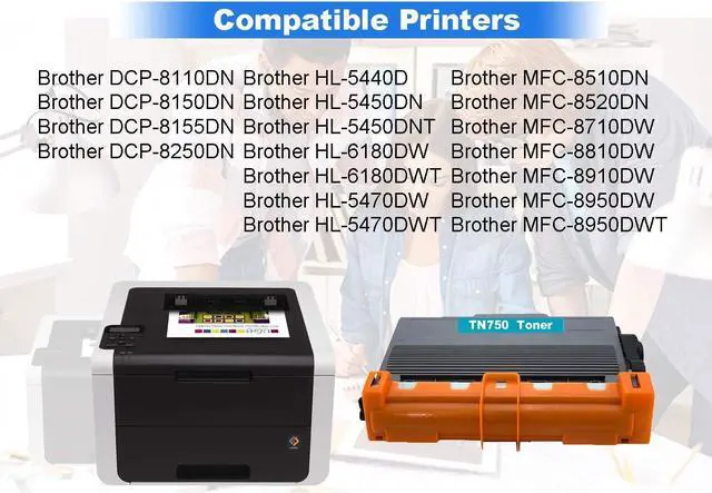 • 3. Suitable for use in Brother Printers: DCP-8110DN, DCP-8150DN, DCP-8155DN, MFC-8950DWT, MFC-8950DW, HL-5440D, HL-5450DN, HL-5470DW, HL-5470DWT, HL-6180DW, HL-6180DWT, MFC-8510DN, MFC-8710DW, MFC-8510DW, MFC-8810DW, MFC-8910DW, DCP-8110, DCP-8150, DCP-8155, HL-5440, HL-5440D, HL-5445, HL-5450, HL-545,2 HL-5470, HL-5472, HL-6180, MFC-8110, MFC-8250, MFC-8510, MFC-8515, MFC-8520, MFC-8950, MFC-8950DW, MFC-8952