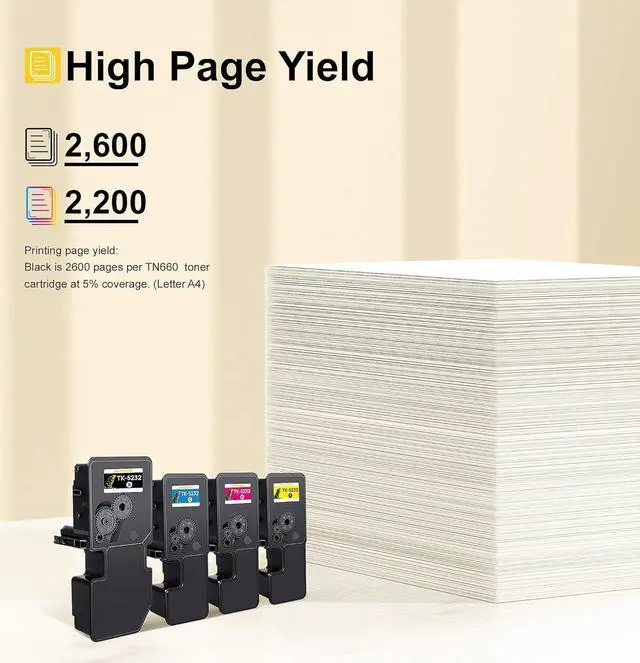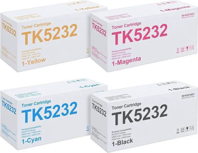 Content: 4 Pack of SHEENGO compatible toner cartridge replacement for Kyocera TK-5232 TK5232 TK-5232K TK-5232C TK-5232M TK-5232Y toner cartridge (1 Black 1 Cyan 1 Magenta 1 Yellow). Printer Compatibility: Kyocera Ecosys M5521cdw Ecosys P5021cdw Ecosys P5021cdn Ecosys M5521cdn Printer.