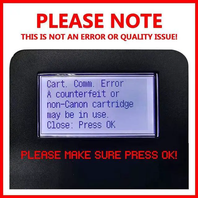 When you install toner cartridge first time, the printer may display such warnning message: Cart. Comm. Error, a counterfeit or non-Canon cartridge, maybe in use. This is NOT A QUALITY ISSUE, Please Make Sure Press OK. Then the toner cartridge can work normally