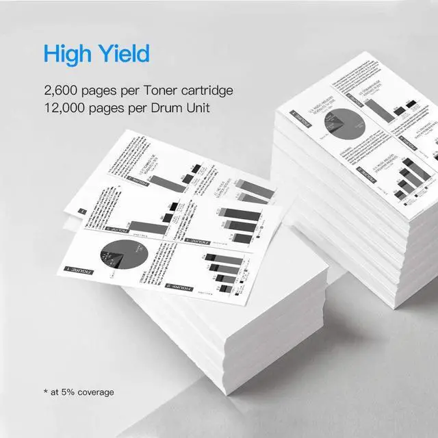 Page Yield: Up to 2,600 pages per black TN660 toner cartridge and 12,000 pages per DR630 drum unit at 5% coverage in accordance with ISO/IEC 19798 (Letter) * A4 is larger than Letter paper and therefore 5% will be more ink on the page on A4 vs letter.