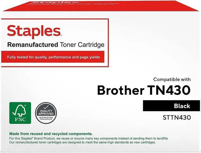 Staples remanufactured Brother TN-430 black toner cartridges deliver high-quality prints for various Brother all-in-one machines. Staples remanufactured Brother TN-430 black toner cartridges for Brother all-in-one machines have exact yield counts at 5 percent coverage per page so you can manage your inventory efficiently. That way, you never run out of cartridges and you can plan to purchase them at a specific time of the year. Combine this quality remanufactured product with reliable Brother machines for consistent, everyday prints. Package contains one remanufactured black laser toner cartridge. Unlike bargain replacement inks, original Staples remanufactured Brother TN430 black toner cartridges are designed specifically to work with Brother printers for exceptional reliability and performance. Package contains 100 percent recycled content for even more waste-reduction practices. Compatible with Brother all-in-1 laser printer models DCP-1200, DCP-1400, Fax 8350P, 8360P, 8750P, HL-1030, HL-1230, HL-1240, HL-1250, HL-1270N, HL-1430, HL-1435, HL-1440, HL-1450, HL-1470N, IntelliFax-4100, IntelliFax-4750, IntelliFax-4750e, IntelliFax-5750, IntelliFax-5750e, MFC-8300, MFC-8500, MFC-8600, MFC-8700, MFC-9600, MFC-9650, MFC-9660, MFC-9700, MFC-9750, MFC-9760, MFC-9800, MFC-9850, MFC-9860, MFC-9870, MFC-9880 and MFC-P2500. Third-party tested for reliability. Reliable high-quality printing. Coverage of 5% of the page for standard use and consistent page counts. Environmentally responsible remanufacturing and end of life process. Recharge your Brother all-in-one machines with Staples remanufactured Brother TN-430 black toner cartridges that have precise yield counts. Manufacturer's one year limited warranty offers peace of mind. ConsistencyThird-party testing of the Staples remanufactured Brother TN-430 black toner cartridges and a one-year limited warranty ensure you get a top-quality product for your Brother all-in-one printers or fax machines.
