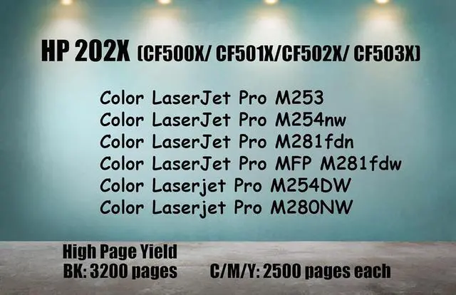 HP 202X CF500X / CF501X / CF502X / CF503X High Yield Toner Cartridge of HP 202A (BK/C/M/Y) Compatible Printer List: Removing the protective sealing tape Removing the cover Removing the orange pins Shaking the toner cartridge