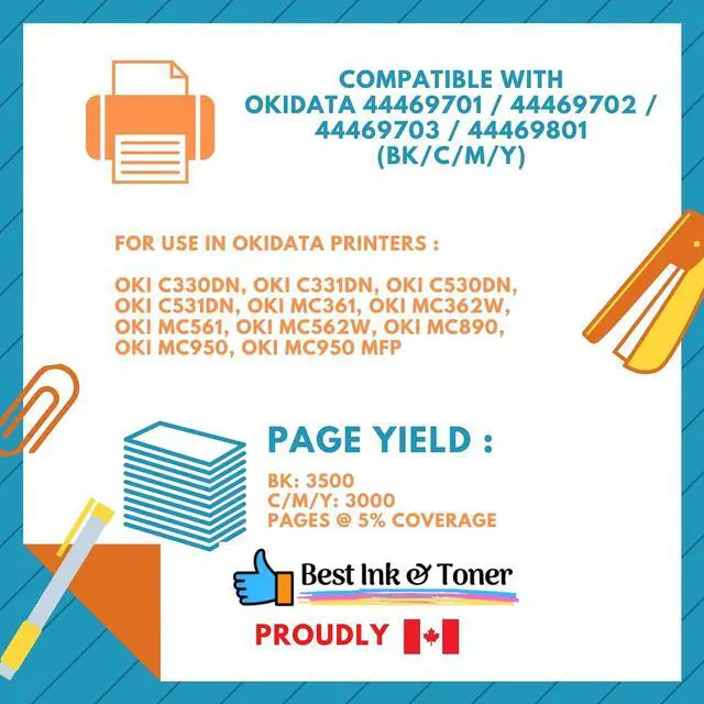 ompatible with:Oki C330dn ,Oki C331dn ,Oki C530dn ,Oki C531dn ,Oki MC361 ,Oki MC362W ,Oki MC561 ,Oki MC562W ,Oki MC890 ,Oki MC950 ,Oki MC950 MFP AND Page Yield:3500 Pages for Black & 3000 Pages each Color C/M/Y