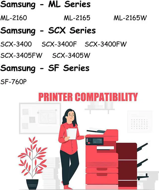 Printer Pro is a premium brand of toner cartridge. All of our printer cartridges are certified with ISO-9001/14001 & STMC. This toner cartridge is warrantied with a 365 Days according to Seller Returns Policies. We strongly suggest that when placing order, please confirm the cartridge model and shipping address are correct. Compatible with Samsung ML-2160 / ML-2165W / ML-2165 / SCX-3405FW / SCX-3400 / SCX-3400F / SCX-3400FW / SCX-3405 / SCX-3405W / SF-760P. If you have any questions regarding your order, please feel free to contact us. We are happy to assist.
