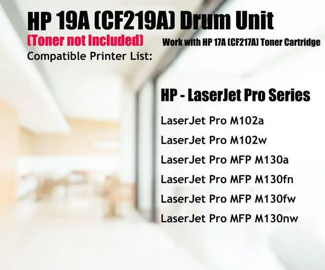 HP 19A CF219A Compatible Drum Unit, Use With HP 17A Black Toner Cartridge. (This is Drum, NOT Toner!) Compatible Printer List: Removing the protective sealing tape Removing the cover Removing the orange pins Shaking the toner cartridge