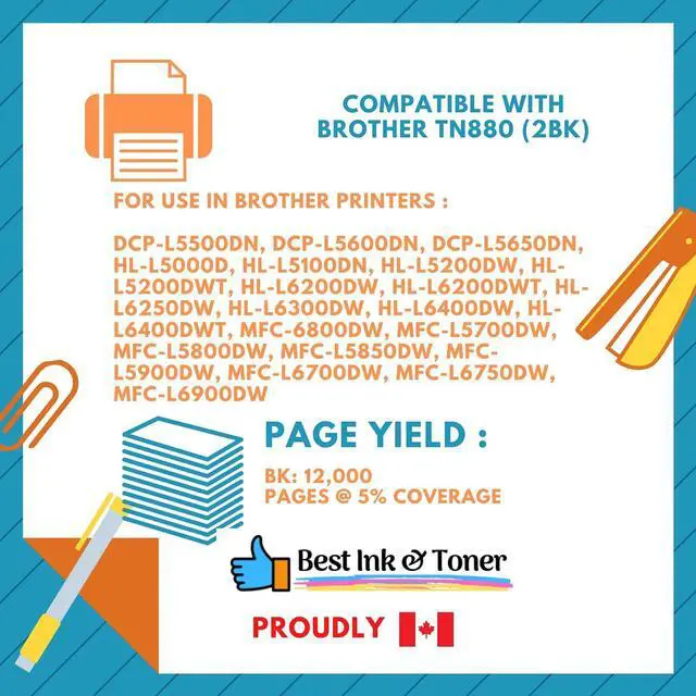Best Toner compatible for Brother TN880 Super Extra High Yield (12000 Page Yield) for use in Brother -DCP-L5500DN DCP-L5600DN DCP-L5650DN HL HL-L5000D HL-L5100DN HL-L5200DW HL-L5200DWT HL-L6200DW HL-