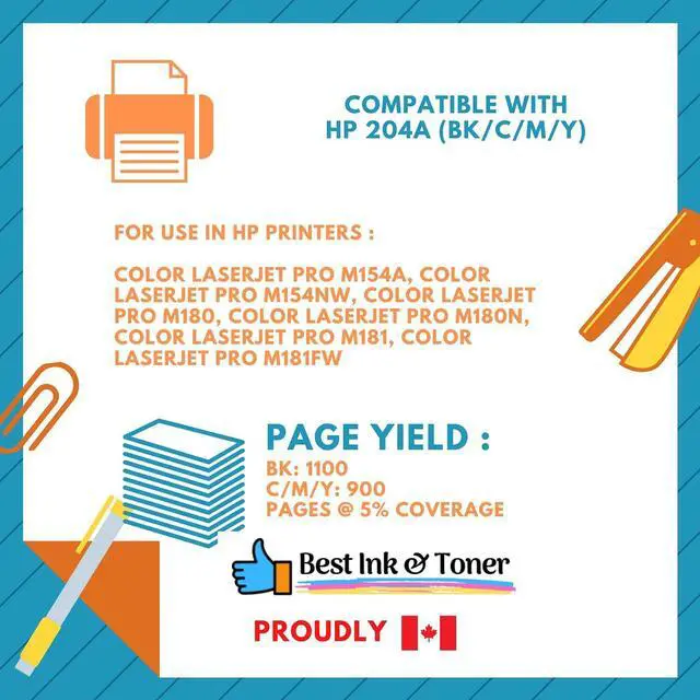 Best Compatible High Quality Toner for HP 204A CF510A CF511A CF512A CF513A Toner Cartridge Combo BK/C/M/Y, Color LaserJet Pro M154a, Color LaserJet Pro M154nw, Color LaserJet Pro M180, Color LaserJet