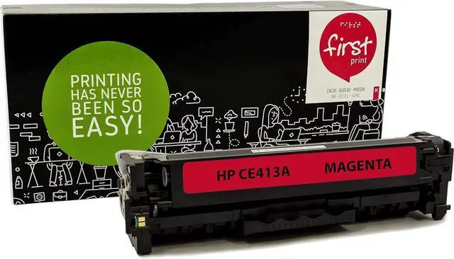 This is NOT an OEM cartridge. Compatible Magenta Toner Cartridges for CE413A 305A 2,600 Page Yield @ 5% Coverage Compatible Printers: LaserJet Pro 300 Color M351A ,LaserJet Pro 300 Color MFP M375nw, LaserJet Pro 400 Color M451 series, LaserJet Pro 400 Color MFP M475, LaserJet Pro 400 Color MFP M475dn, LaserJet Pro 400 color M451dn, LaserJet Pro 400 color M451dw, LaserJet Pro 400 color MFP M451nw, LaserJet Pro 400 color MFP M475dw First print is your # 1 canadian toner cartridges supplier since 2005. Winner of many business awards over the years, First Print continue year after year to offer the best possible products for our customers. We offer bilingual (French and English) customer service and NO WORRIES of return of the product if you are not satisfied. Certified by ISO9001, ISO14001, CE and SMTC.
