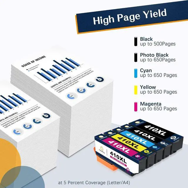 Page Yield: Up to 500 pages per 410XL Black ink cartridge, 650 Pages per 410 XLColor ink cartridge, (5% coverage at A4)