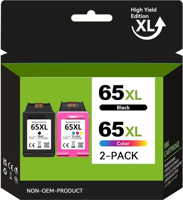Package Contains:1 Pack of 65 XL Black Ink Cartridge for HP 65XL, 1 Pack of 65 XL Color Ink Cartridge For HP65XL (*Note this is not an OEM cartridge)