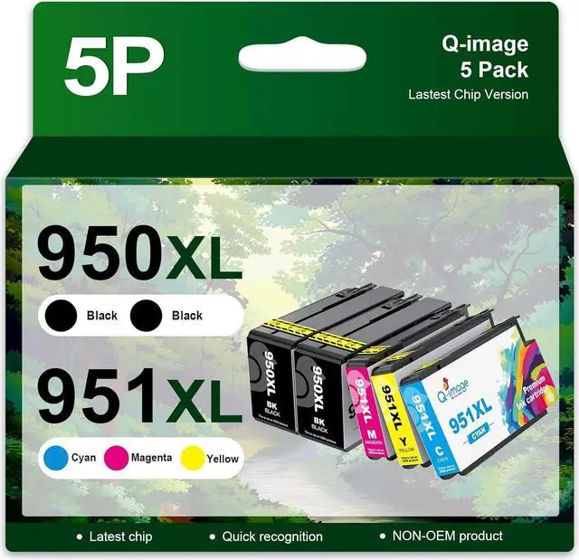 What's in the Package: 2* 950XL Black, 1*951XL Magenta, 1*951XLYellow, 1*951XL Cyan Compatible Ink Cartridge (Total 5 Packs),1*detailed instruction