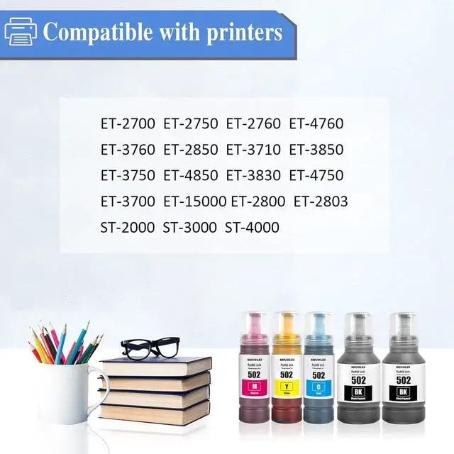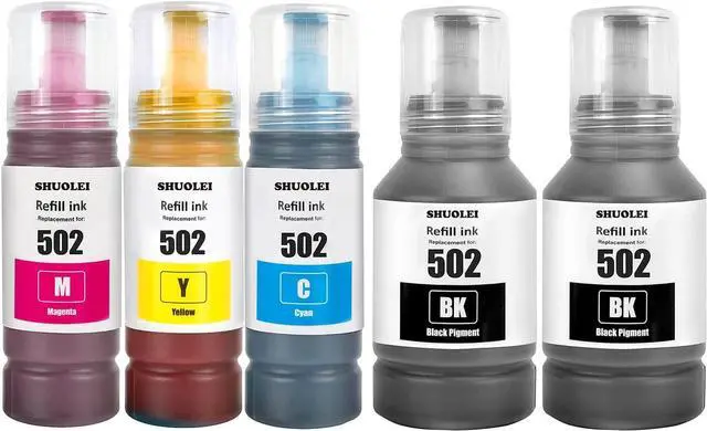 Package Contents Total 5 packs compatible ink bottles 502 T502 Combo Pack (2 x Black T502 Ink Bottle, 1 x Cyan T502 Ink Bottle, 1 x Magenta T502 Ink Bottle, 1 x Yellow T502 Ink Bottle). (NOT ORIGINAL).
