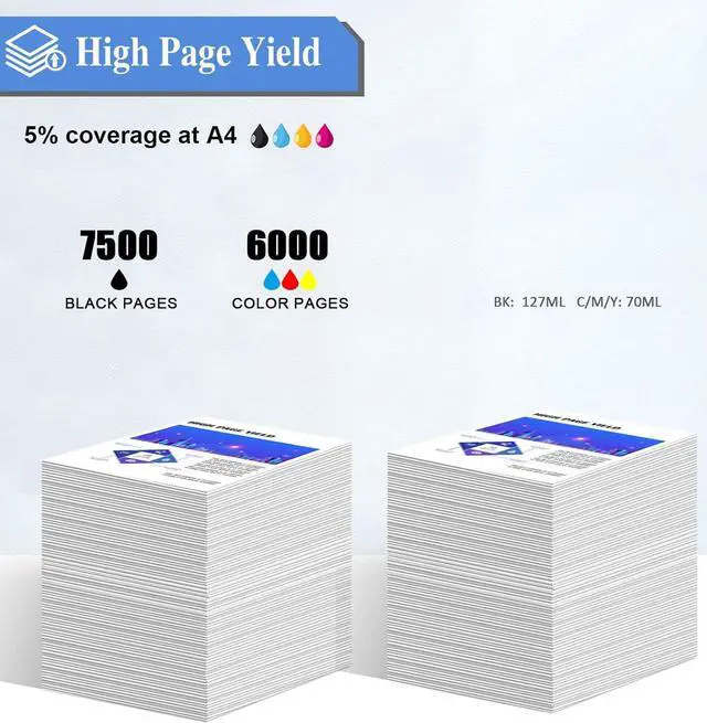 High Page Yield Approximately 7500 pages per T502 black ink bottle 127ml, 6000 pages per T502 Cyan/Magenta/Yellow Ink Bottle 70ml (with 5% coverage of A4 paper).