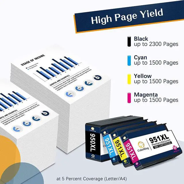 High Page Yield: 2300 pages for HP 950XL 950 XL Black Ink Cartridge, 1500 Pages for HP 951XL 951 XL Color Ink Cartridges at 5 Percent Coverage