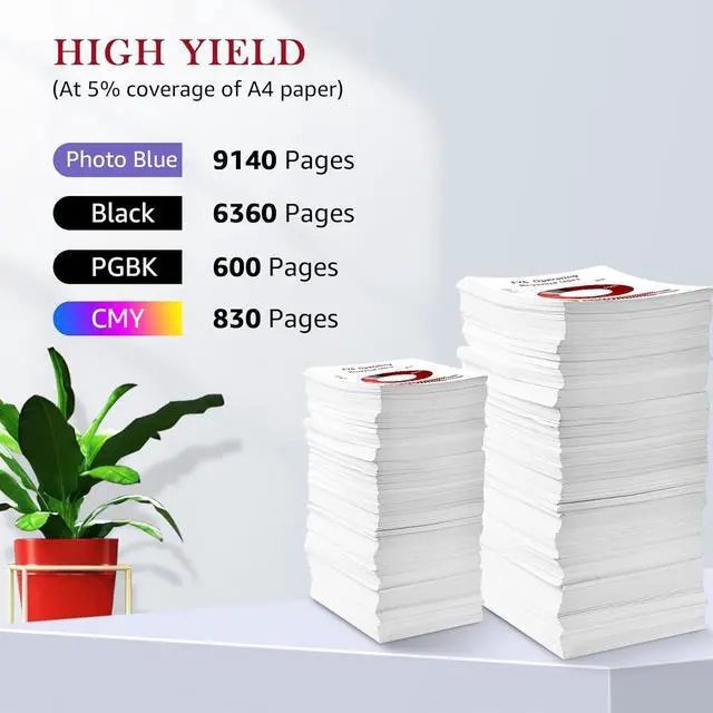 High Page Yield: For canon ink 280 and 281 cartridges, 600 Pages per 280xxl Large Black; 9160 per 281xxl Photo Bule; 6360 Pages per 281xxl Black; 830 Pages per 281xxl color cartridge