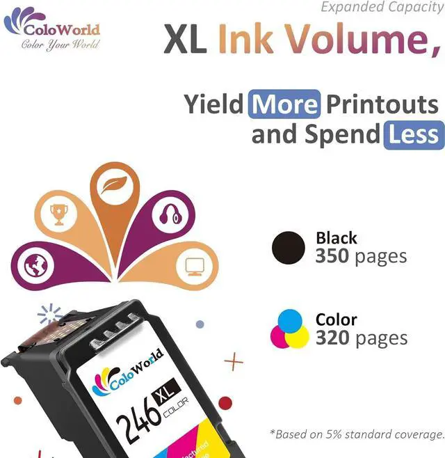 • Page Yield]: 350 Pages per PG-245XL Black Ink Cartridges, 320 Pages per CL-246 XL Color Ink Cartridge, Based On 5% Standard Coverage