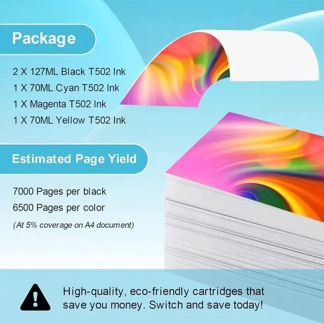 Our high-quality Epson T502 ink refill bottles is designed to deliver exceptional performance and reliability, ensuring vibrant and sharp prints every time.