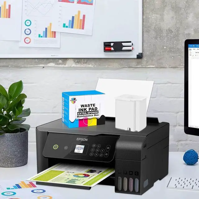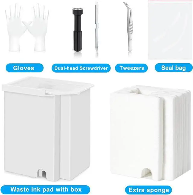 What's in the box: Replacement Maintenance Tank (Ink Pad Sponge Included) * 1, Extra Sponge Absorbant Pad * 1, Dual head screwdriver * 1, Seal bag * 1. Everything you need to replace the maintenance box is in the box, easy to do.